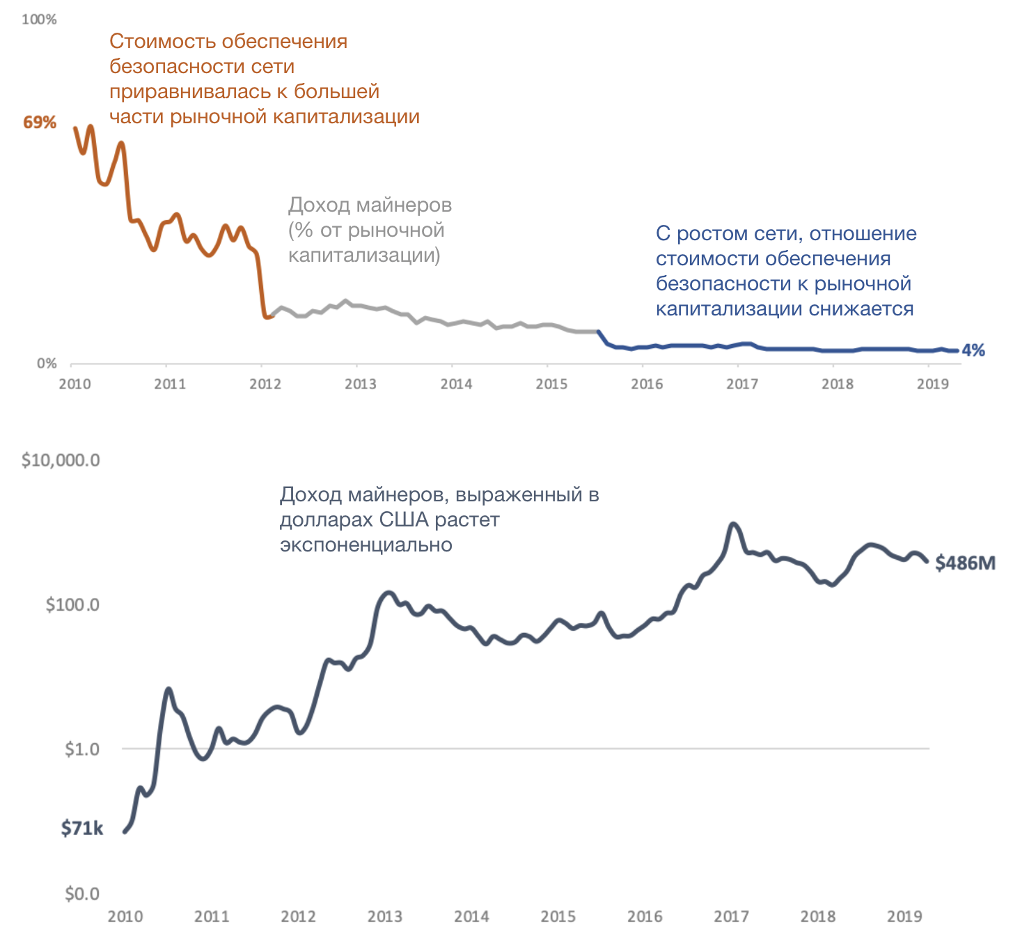 Сегодня сеть Биткоин защищена, прежде всего, ценностью награды за блок (12.5 BTC/10 минут), которая фактически является ценой, уплачиваемой всеми держателями биткоинов. Таким образом, затраты на обеспечение безопасности сети равномерно распределяются между всеми ее участниками. Но в какой-то момент в будущем, поскольку количество биткоинов, появляющихся с каждым блоком, будет продолжать сокращаться вдвое, безопасность сети Биткоин будет в большей степени обеспечена комиссиями за транзакции, уплачиваемыми физическими лицами, инициирующими эти самые транзакции. Безопасность сети на сегодняшний день, в основном, обеспечивается за счет держателей монет (награда за блок), но эта ответственность постепенно перекладывается на участников сети, инициирующих транзакции (комиссия за транзакцию). Исторически этот процесс перехода повышал общую безопасность сети посредством увеличения доходов, получаемых майнерами и измеряемых в долларах США. При этом, общая стоимость поддержания безопасности Биткоина снижалась.