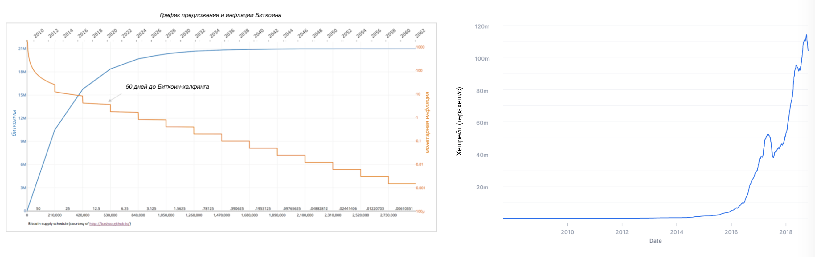 Запас биткоинов зафиксирован на отметке 21 миллион монет. Монеты выпускаются по предопределенному графику в среднем каждые 10 минут. В первые четыре года майнер, нашедший новый блок, получал 50 BTC, спустя четыре года награда снизилась до 25 BTC и продолжала регулярно сокращаться вдвое. Данное явление называется халвингом. Учитывая это правило, мы получаем график выпуска новых монет, который предусматривает награду майнеров до тех пор, пока 21 миллион биткоинов не станет доступен для транзакций. Примерно к 2140 году награда майнерам постепенно сойдет на нет. Кроме того, объем данных, который сеть Биткоина может обрабатывать каждые 10 минут, является фиксированным. Это приводит к, так называемой, войне за пространство в блоках, известную как рынок транзакционных сборов.