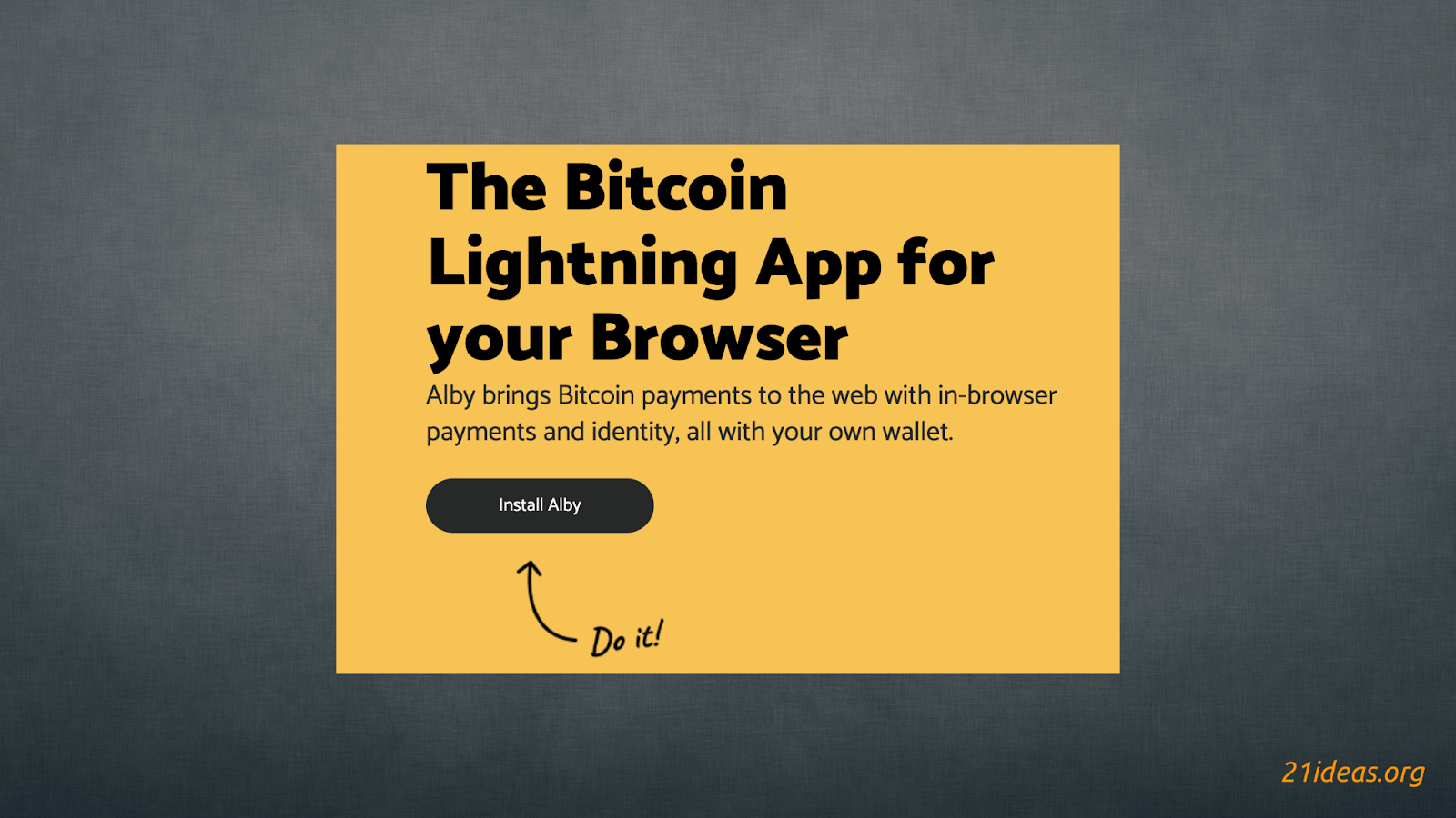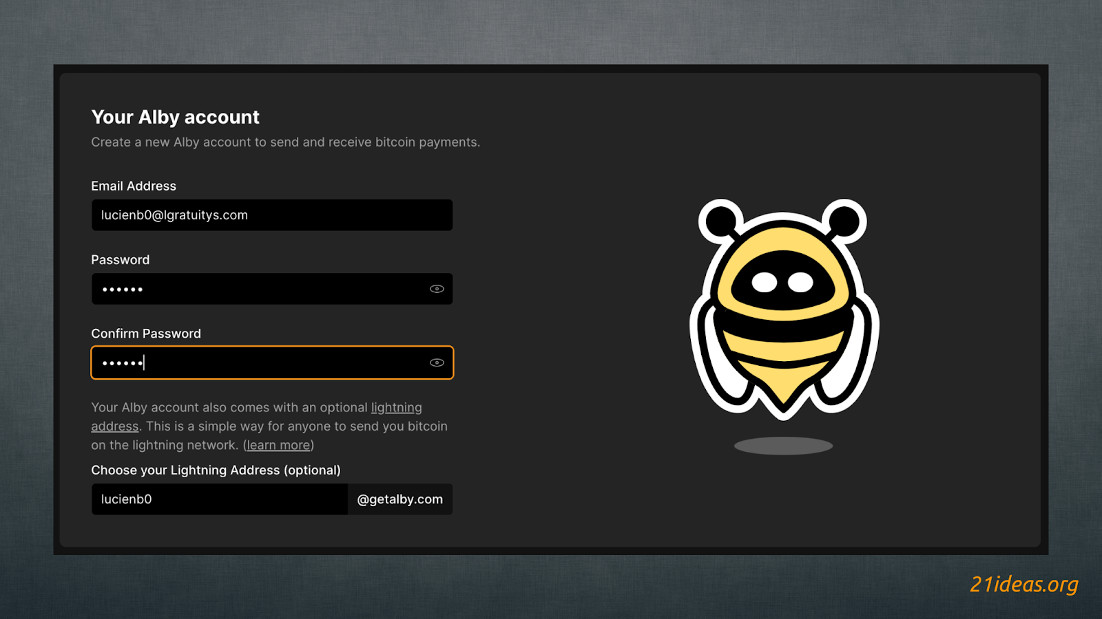 Ваш аккаунт создан! Теперь вы можете обмениваться сатами прямо из браузера, а также вставлять свой лайтнинг-адрес в описание своих аккаунтов в социальных сетях, чтобы ваши подписчики могли с легкостью отправлять вам саты. Единственное, что нужно сделать – это добавить эмоджи ⚡️ перед ЛН-адресом, чтобы его не спутали с обыкновенной электронной почтой. Мой лайтнинг-адрес, например, выглядит так: ⚡️21ideas@getalby.com. Не постесняйтесь отправить немного сат, если этот гид или любой другой мой труд оказался вам полезен.