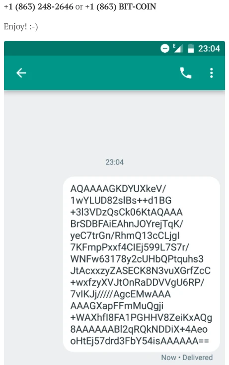 Выше приведен скриншот Биткоин-транзакции через SMS из статьи Руснака. Вы можете отправить транзакцию на номер телефона, указанный в верхней части изображения, и данные будут переданы в основную сеть.