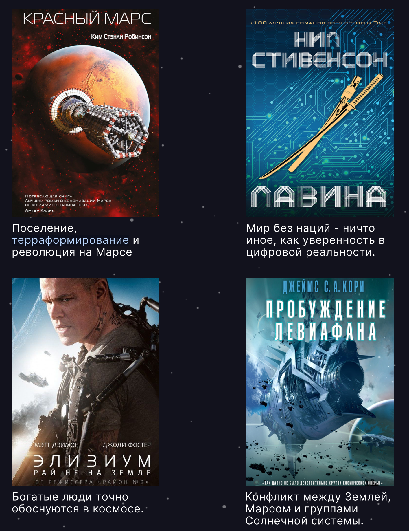 - Платежи: Марс — самодостаточный мир, полный денежных потоков, генерируемых нашими трудолюбивыми гражданами. Марсиане управляют всеми магазинами, фабриками и службами, на которые мы полагаемся. И марсианская виртуальная реальность — это самый популярный контент, транслируемый на Земле! Да, нам удается сохранить небольшую часть платы за маршрутизацию, но все комиссии за оплату нашего труда накапливаются в и без того полной казне алчных майнеров-землян. Вернем марсианские платежи марсианам!