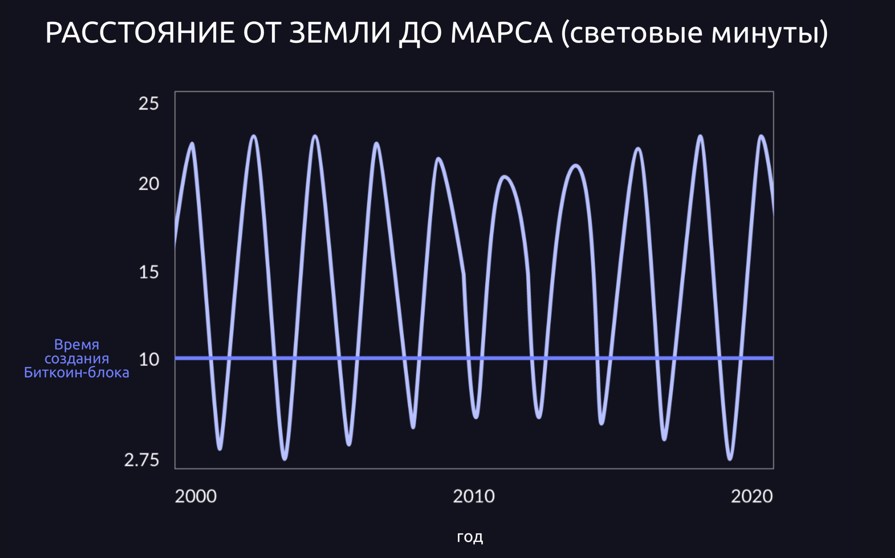 Марс находится на расстоянии от 3 до 22 световых минут от Земли (в среднем 12,5 световых минут), что транслируется во время прохождения сигнала в оба конца от 6 до 44 минут (в среднем 25 минут). Время создания Биткоин-блока составляет всего 10 минут. [Источник]