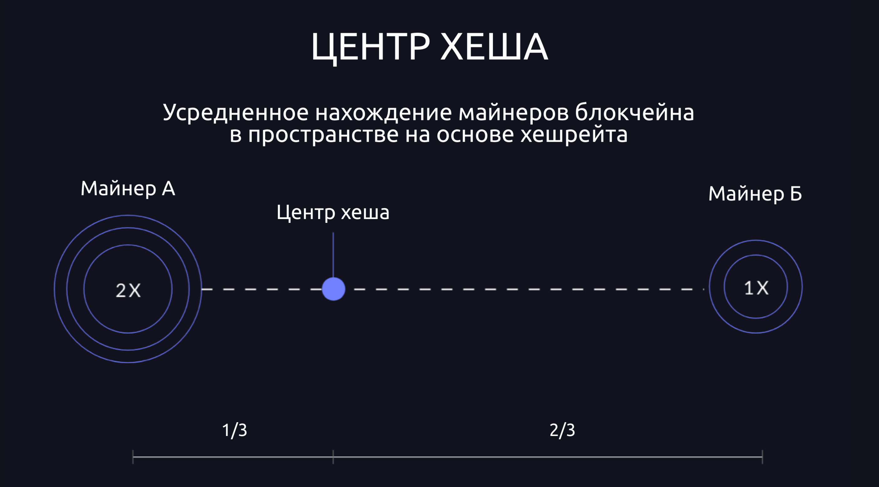 Представьте двух майнеров A и Б, разделенных расстоянием. Хешрейт майнера A вдвое больше такового у майнера Б. Их центр хеширования будет расположен в точке на расстоянии 1/3 расстояния между ними, ближе к майнеру A. Аналогичный расчет может вычислить центр хеша для многих майнеров, обладающих разными хешрейтами и распределенных в пространстве. Сравните с центром масс.