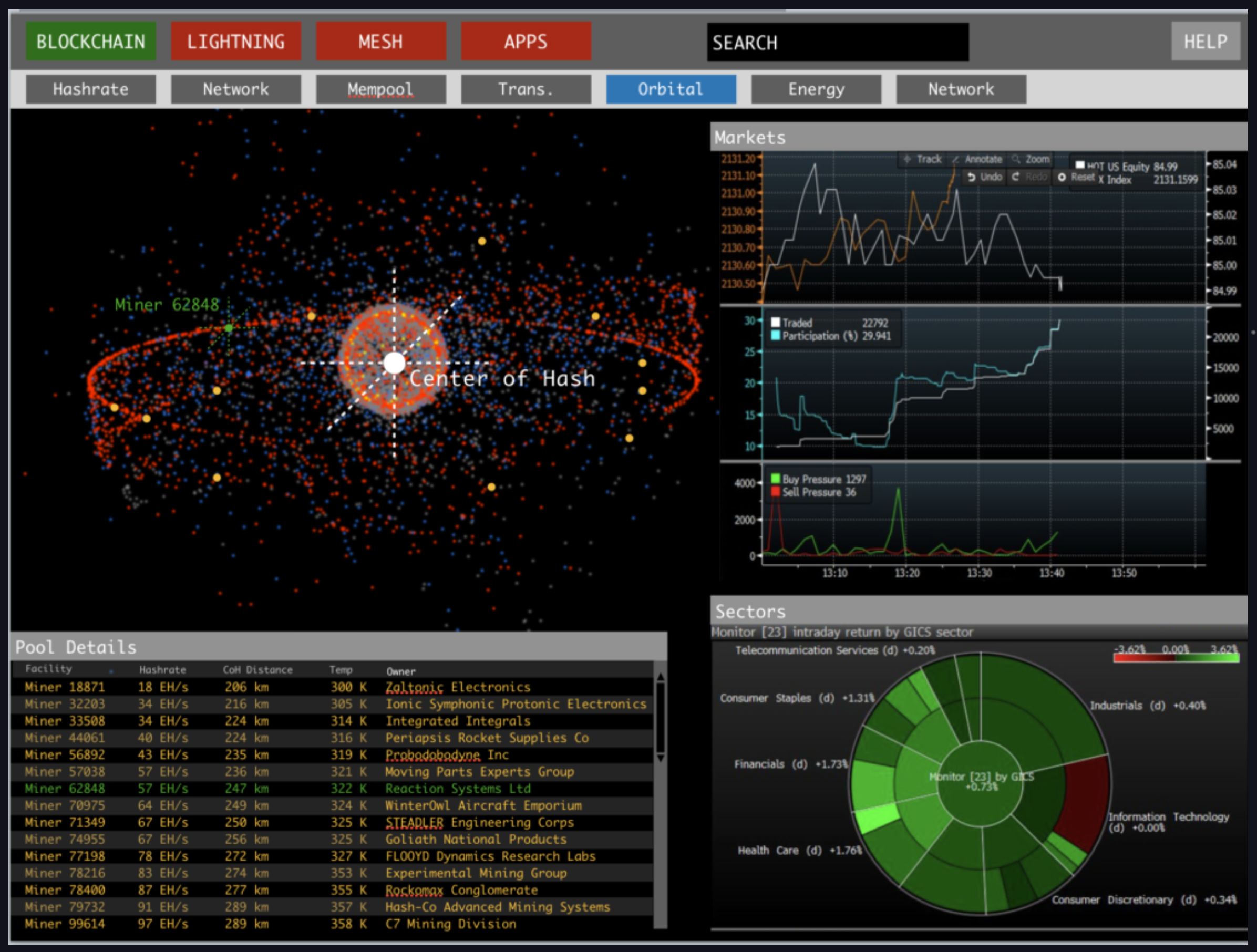 Снимок экрана терминала Bloomberg 2130 года. Центр хеша Биткоина находится недалеко от центра Земли, он слегка смещен в сторону местоположения Луны, на которой размещено 15% всех Биткоин-майнеров. [Источник]