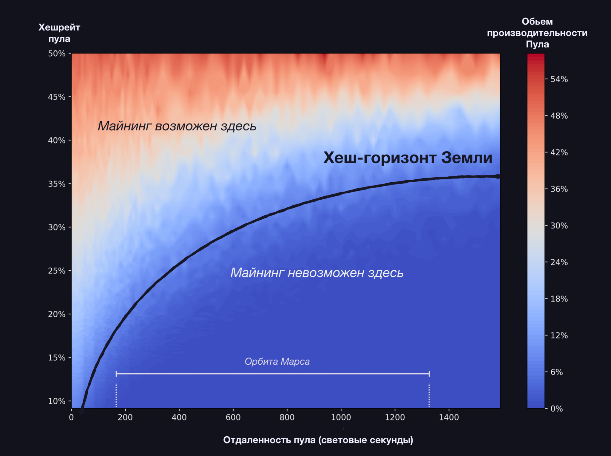 Марс, в частности, находится за пределами хеш-горизонта Земли. Марсиане не могут конкурировать в обеспечении безопасности используемых ими денег. Эта ситуация не уникальна для Марса. Потенциальные Биткоин-майнеры на любом значительном расстоянии от Земли будут аналогичным образом подавлены (все было бы иначе, выбери Сатоши другое время подтверждения блока). Действительно, в статье, упомянутой ранее, Кларк делает вывод: если не брать во внимание невероятную удачу, доминирующая в майнинге планета останется доминирующей во всей Солнечной системе.