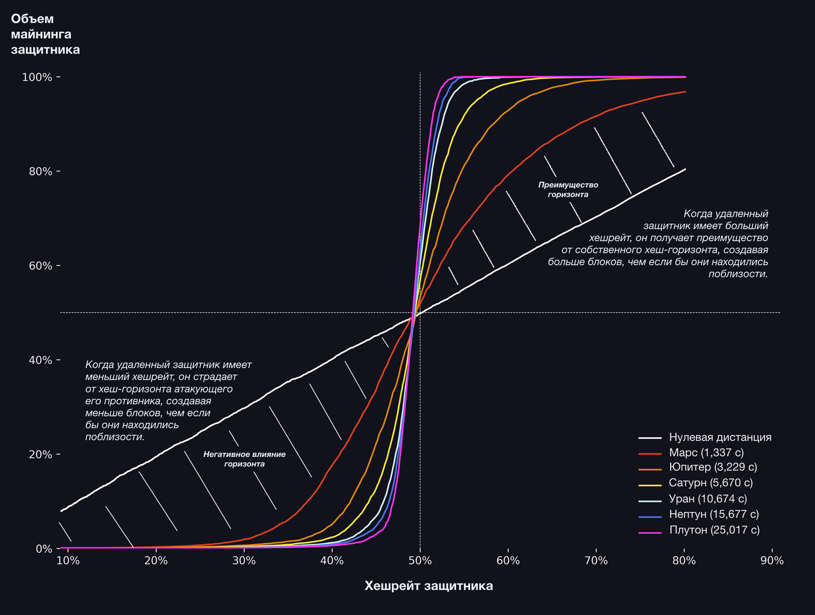 Следуя красно-оранжевой кривой, представляющей расстояние до Марса, влево, где защитники Марса имеют меньший относительный хешрейт, чем атакующие, кривая падает быстрее, чем белая линия, представляющая нулевое расстояние. Это прямое следствие закона хеш-горизонтов — нахождение в меньшинстве и на расстоянии транслируется в недостаточность объема майнинга. И наоборот, следуя красно-оранжевой кривой Марса вправо, она поднимается быстрее, чем белая линия, представляющая нулевое расстояние. Вновь вступает в силу закон хеш-горизонтов, но на этот раз в проигрышной ситуации оказываются атакующие, потому что их хешрейт нивелируется расстоянием; этот эффект еще более драматичен для более удаленных планет. Чем дальше запускается новый блокчейн от его потенциальных атакующих, тем меньше относительного хешрейта требуется для его защиты.