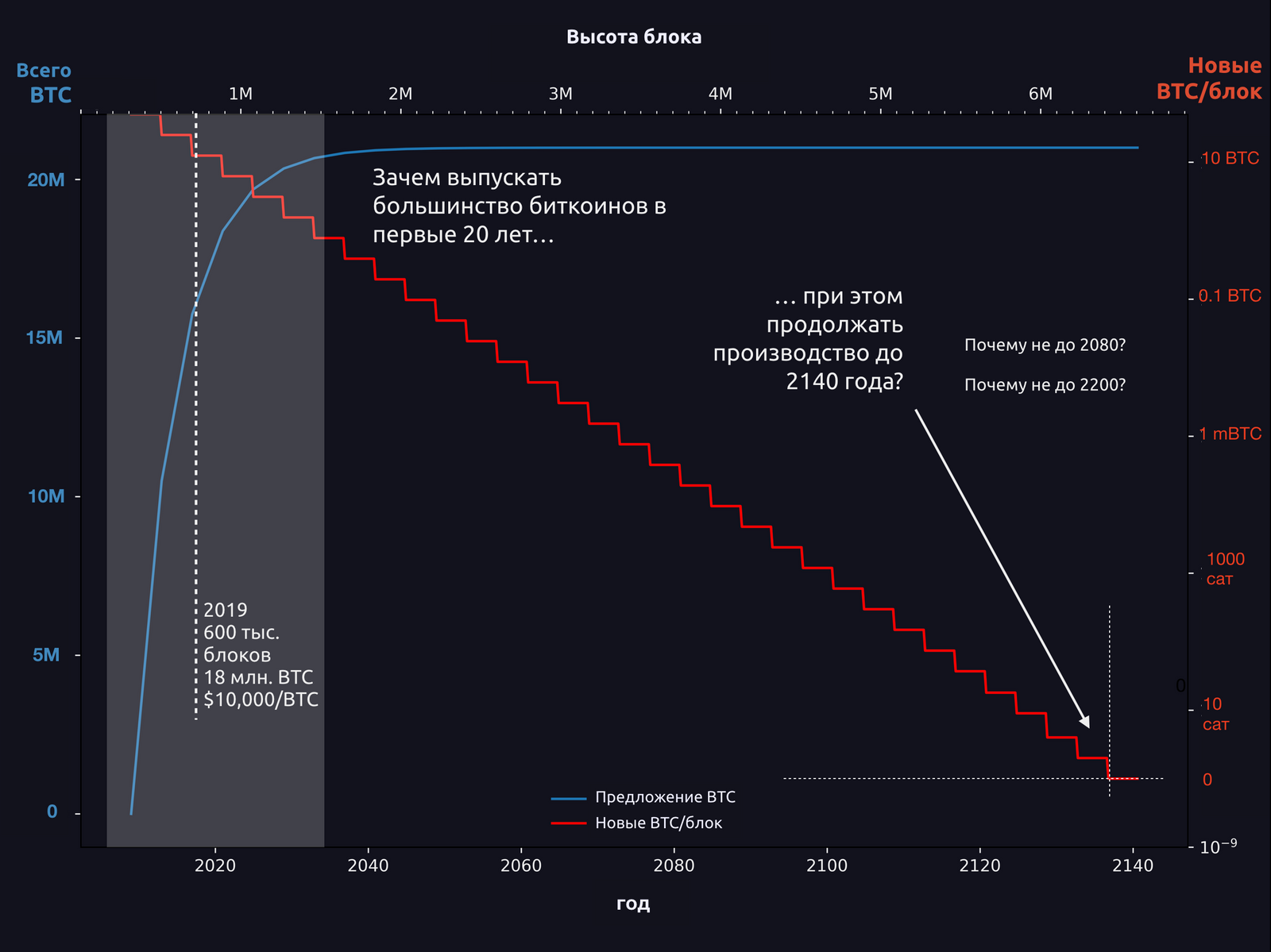 То, что большинство BTC производились в первые 20 лет истории Биткоина имеет смысл — необходимо поощрять ранних пользователей к популяризации и работе над сетью. Но зачем продолжать выделять крошечные количества BTC на блок в течение еще 120 лет? Почему не 60 или 240? Что если Сатоши пытался что-то рассчитать …