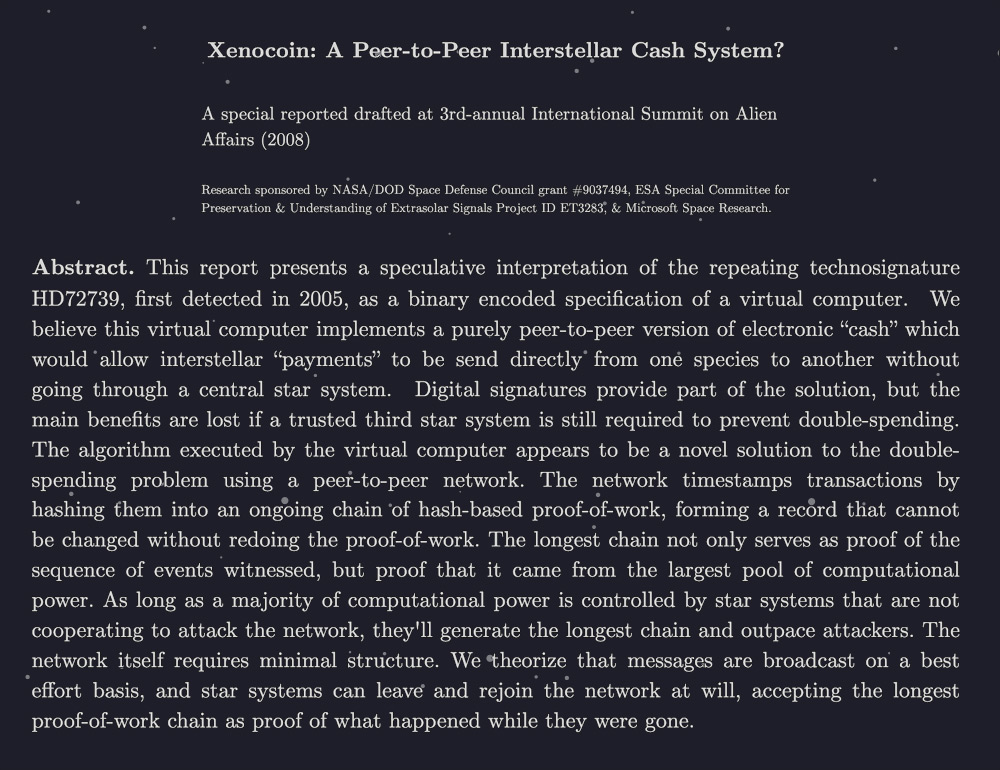 На временнóй шкале, где человечество получало Xenocoin-сигнал до того, как мы изобрели Биткоин, документ Xenocoin мог бы стать основой Земного блокчейна вместо вайтпейпера Биткоина.