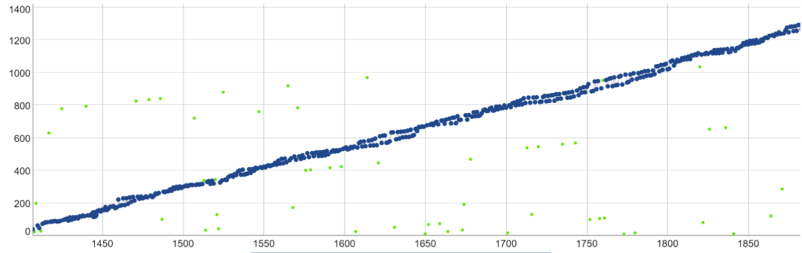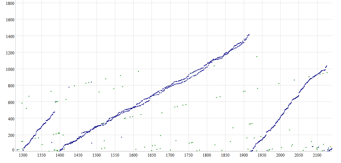 Возможно, вы заметили, что первая диаграмма распределения временных меток в разделе “Тормозящий Сатоши” исключила блоки 1400–1916 из своего набора данных. Почему? Потому что в этот период времени произошло уникальное явление, которое искажает расчеты дельты временной метки блока Патоши. Одновременно работают 2 майнера Патоши!