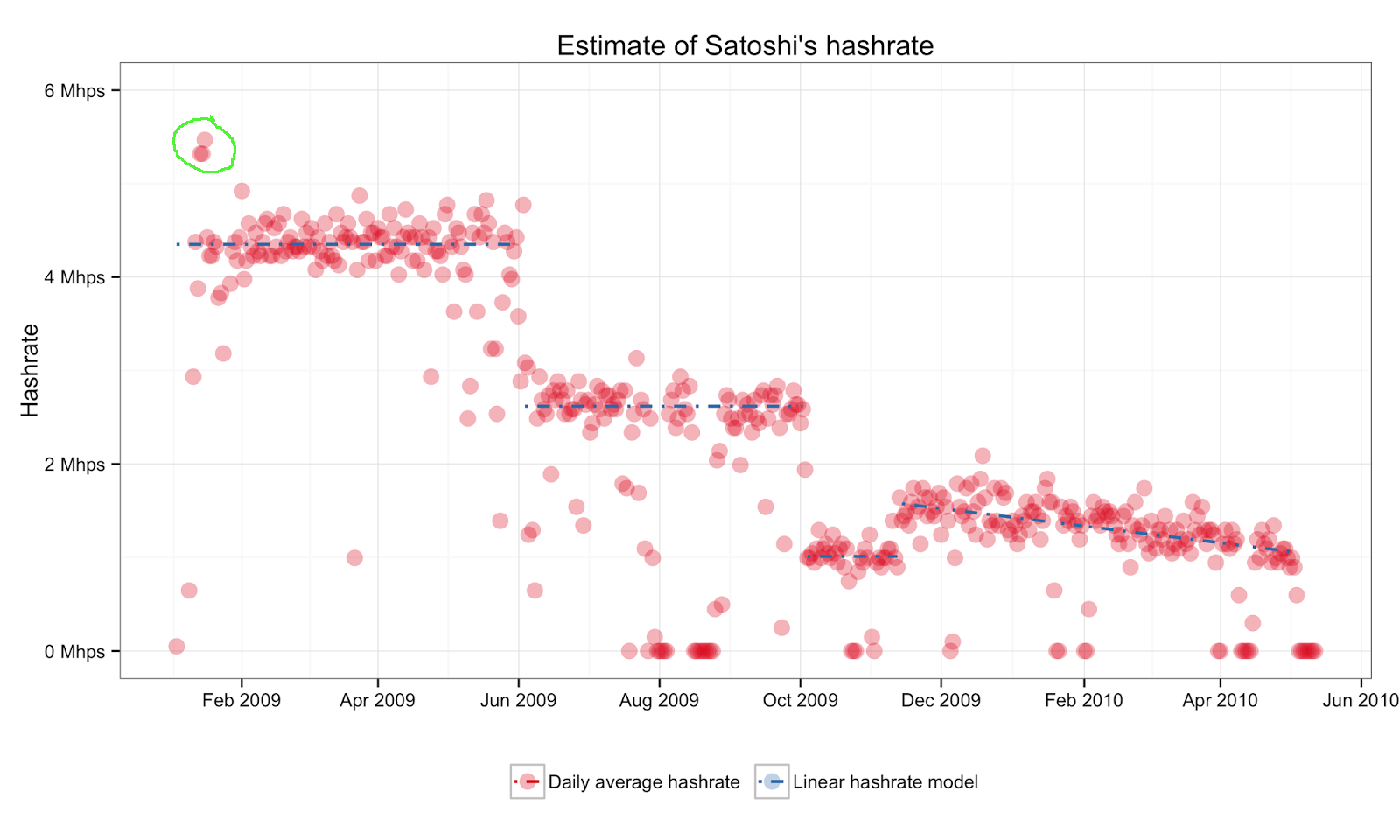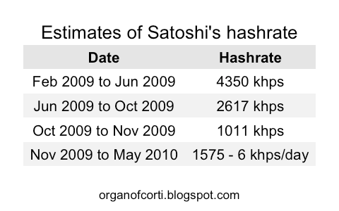 За этот период в 4 дня и 3 часа Сатоши добыл 458 блоков. Из этого можно сделать вывод, что общий суммарный хэшрейт за это время составил около 5.5 Мхэш\сек. Это примечательно, потому что хэшрейт Сатоши за первые 5 месяцев 2009 года в среднем составил 4.3 Мхэш\сек. Это также объясняет выделенное расхождение с предыдущим графиком хэшрейта.
