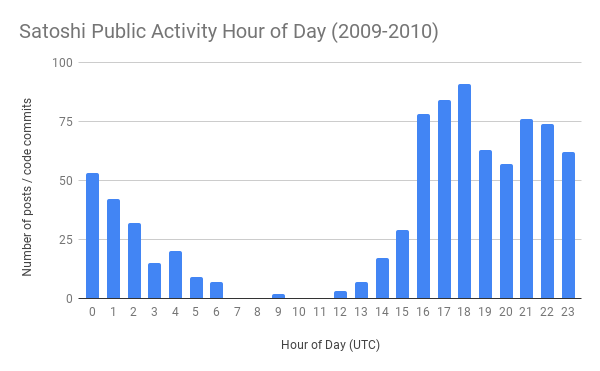 Несколько лет назад я собрал все временные метки публичной активности Сатоши из электронных писем, сообщений на форуме и коммитов кода, чтобы построить следующий график. Я пришел к выводу, что Сатоши придерживался графика сна, соответствующего человеку, живущему в тихоокеанском часовом поясе.