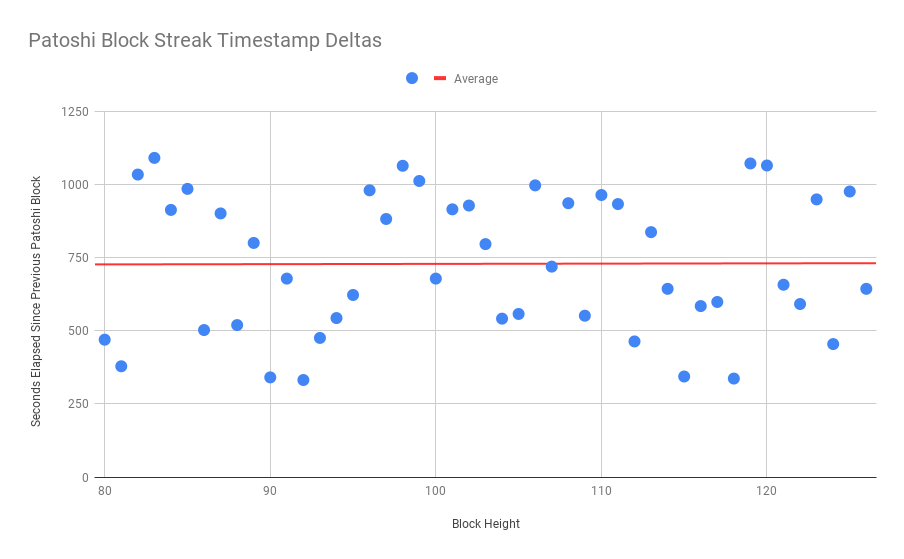 Разница временных меток между каждым блоком, добытым Патоши, и его родительским блоком
