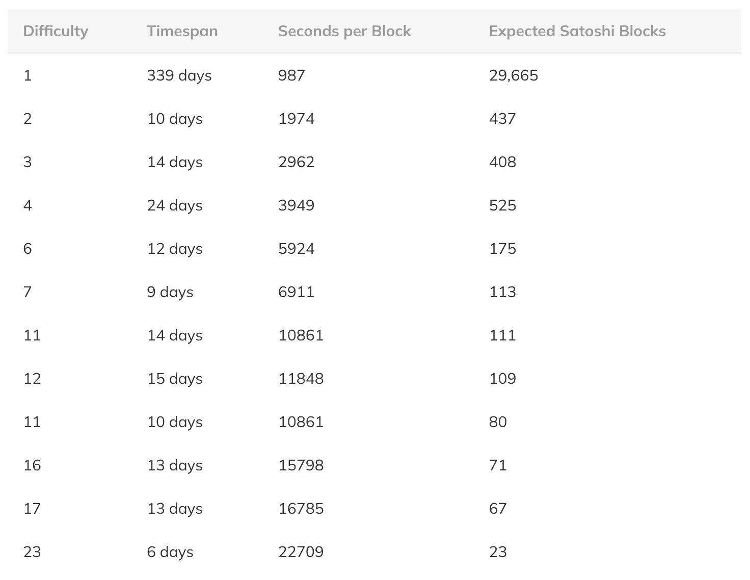Какой процент блоков, как ожидается, будет добыт менее чем через 5 минут после предыдущего блока? 1 — exp(-5/10) = 39,35%. Таким образом, максимальный потенциальный хэшрейт Сатоши на самом деле составлял скорее 6.06 Мхэш\сек. Это интересный результат, поскольку он также довольно близок к наблюдаемому хэшрейту в 5.5 Мхэш\сек в эпоху двойной спирали и чрезвычайно близок к наблюдаемому хэшрейту в 5.97 Мхэш\сек во время ранней серии из 47 блоков.