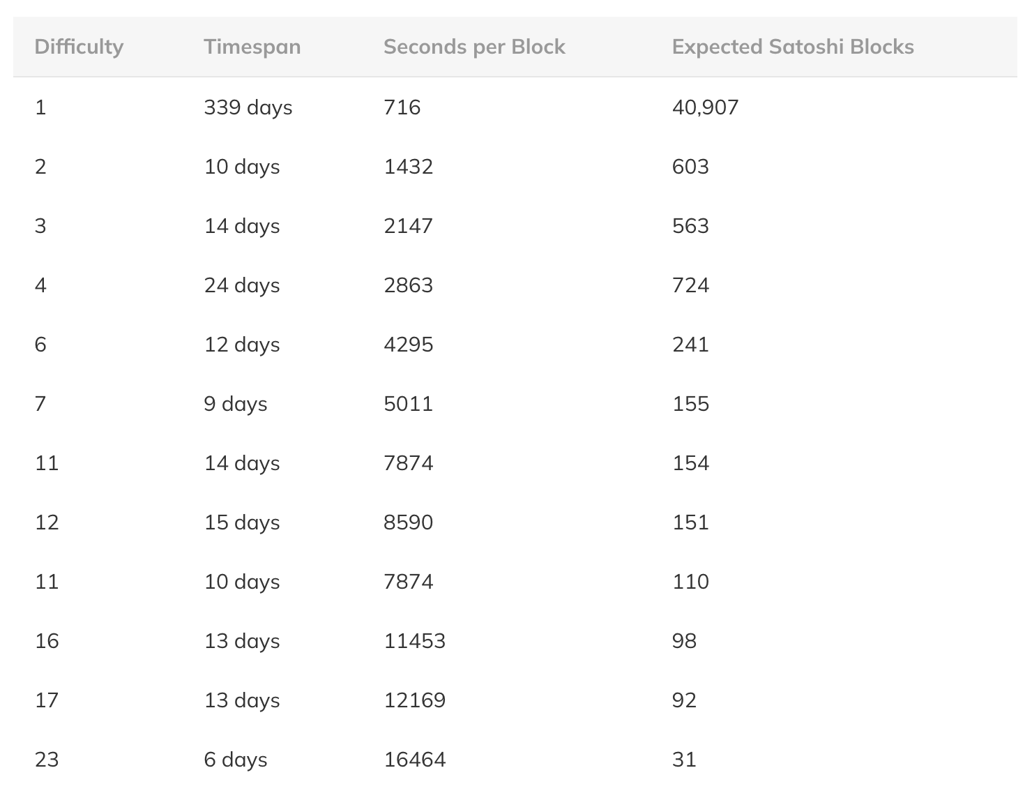 Если бы Сатоши НЕ решился в несколько раз снизить хэшрейт в конце 2009 года, насколько больше BTC он бы заработал? Это легко подсчитать, если принять постоянную цель сложности 1. Согласно скорости майнинга блоков Сатоши и целевой сложностью 1, их первоначальный хэшрейт составлял приблизительно 4,350,000 хэшей в секунду (4.35 Мхэш\сек) Последний блок, приписываемый Сатоши, был #54316; ровно через 14 месяцев после майнинга генезис-блока. Сколько блоков мог бы добыть Сатоши, если бы он майнил при 4.35 Мхэш\сек в течение 14 месяцев при заданной сложности 1?