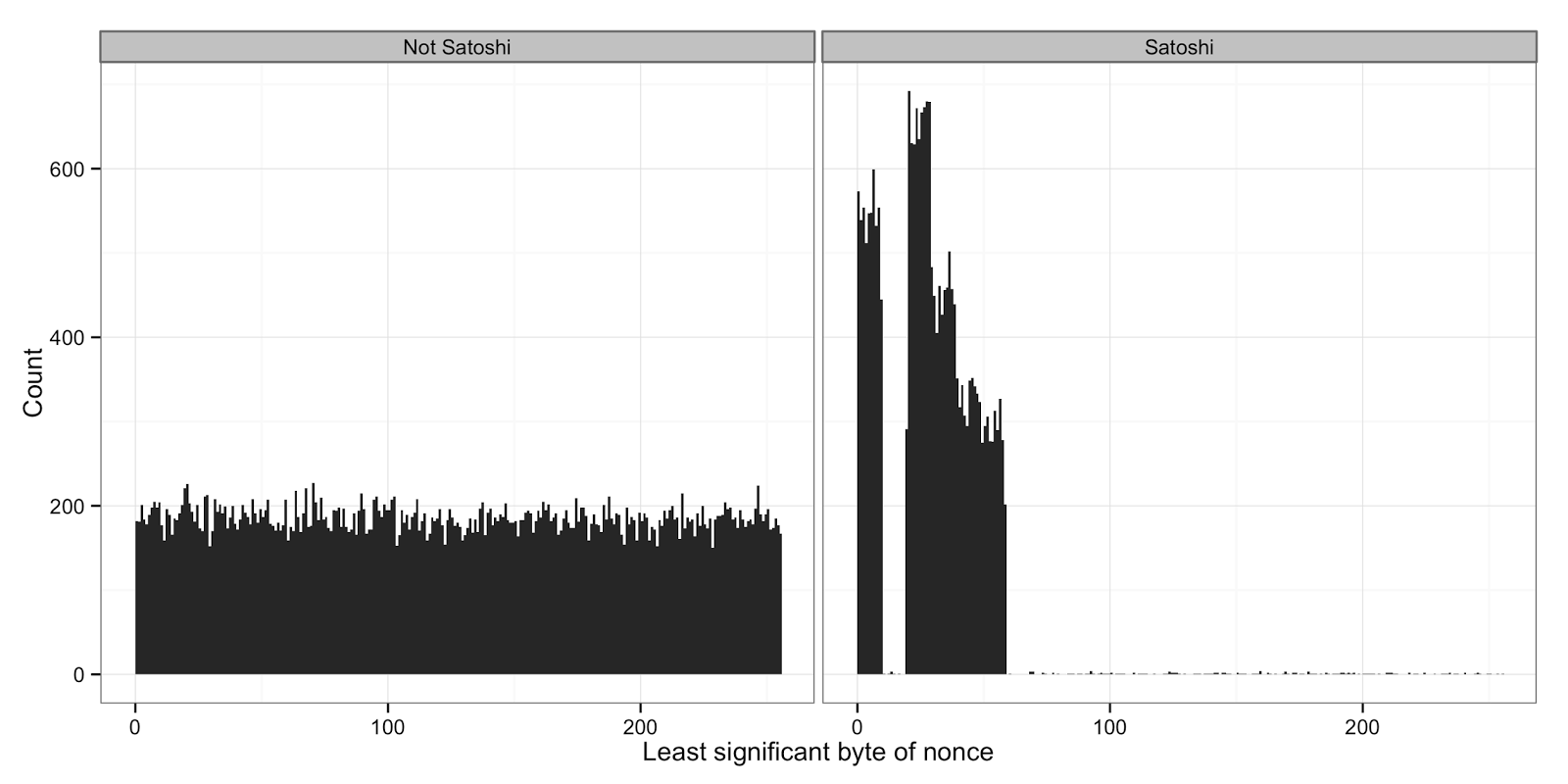 Кроме того, майнер Патоши демонстрирует странное ограничение в значениях nonce, которые он находил для блоков. Существует несколько теорий, почему это может быть так, но я считаю наиболее правдоподобной ту, что Патоши разработал многопоточное программное обеспечение для майнинга, и эти диапазоны были распределены между различными ядрами процессора, так что каждое ядро параллельно сканировало уменьшенное пространство nonce.