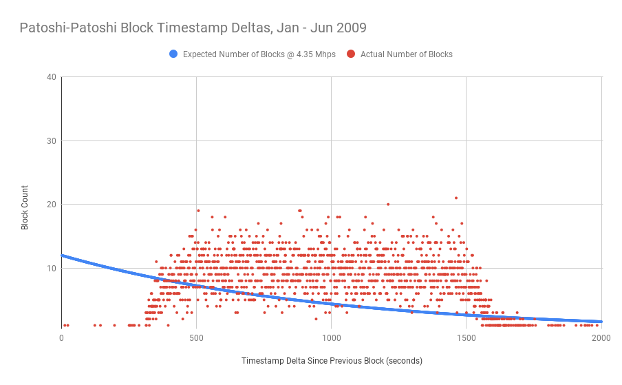 Однако мы также должны помнить, что Сатоши регулярно отключал свой майнер, когда находил блоки с интервалом менее 5 минут. Это фактически является дополнительным преднамеренным ограничением хэшрейта. Так сколько же хэшрейта Сатоши фактически выдавал? Мы можем получить довольно хорошую оценку, основываясь на наших знаниях о пуассоновском распределении блоков. Примечание: если вы хотите спуститься в эту кроличью нору, вы можете ознакомиться с моей предыдущей статьей о дисперсии времени блока.