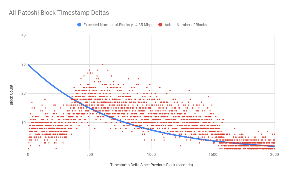 Кроме того, если бы Патоши манипулировали только временными метками добытых блоков, они НЕ смогли бы скрыть общее распределение добытых блоков в течение длительного периода времени и, следовательно, НЕ смогли бы скрыть свой эффективный хэшрейт. Попробуйте не забыть следующие цифры до конца этой статьи держите: 4.35 Мхэш\сек и 6 Мхэш\сек.