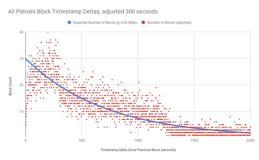 Далее я взял набор данных из предыдущего графика и всякий раз, когда блок добывался более чем через 5 минут после предыдущего блока, я вычитал 5 минут из временной дельты. Мы видим, что в результате мы получили набор данных, который гораздо лучше соответствует ожидаемому распределению.