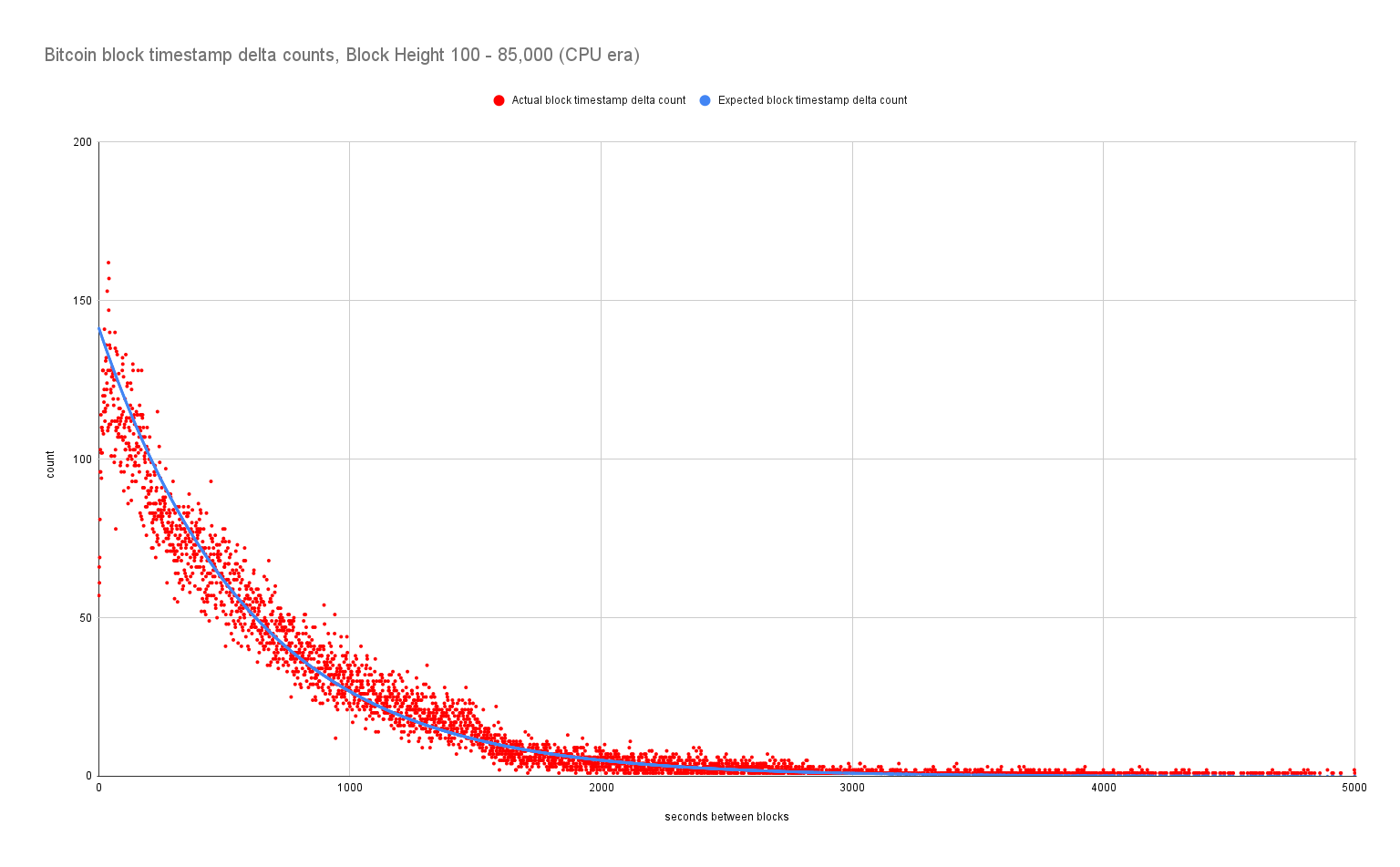 Если вы не читали мое исследование дисперсий времени блока, то вы можете задаться вопросом, действительно ли эти графики значимы — то есть, можем ли мы сравнить их с контрольной группой? Для сравнения, вот график ВСЕХ блоков, добытых во время “эры CPU” Биткоина до того, как в игру вступил майнинг на GPU:
