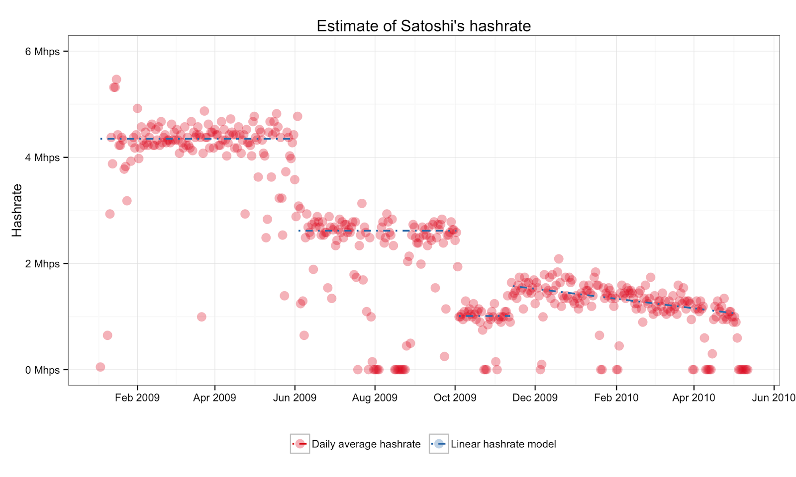 Мы можем наблюдать, что майнер Сатоши прошел 4 разных эпохи хэширования. Сначала они следовали плану снижения хэшрейта на 1.7 Мхэш\сек каждые пять месяцев, но через месяц после второго такого снижения они отказались от этого метода в пользу постоянно снижающегося хэшрейта.