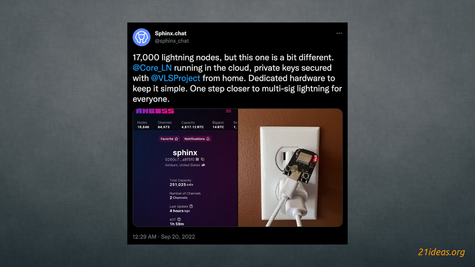 В сети Молния 17,000 узлов, но наш немного отличается. Core Lightning запущен в облаке, приватные ключи защищены с помощью VLS устройством, находящимся дома. Выделенное оборудование значительно упрощает процесс. Мы уже на шаг ближе к мультисигу для Lightning.