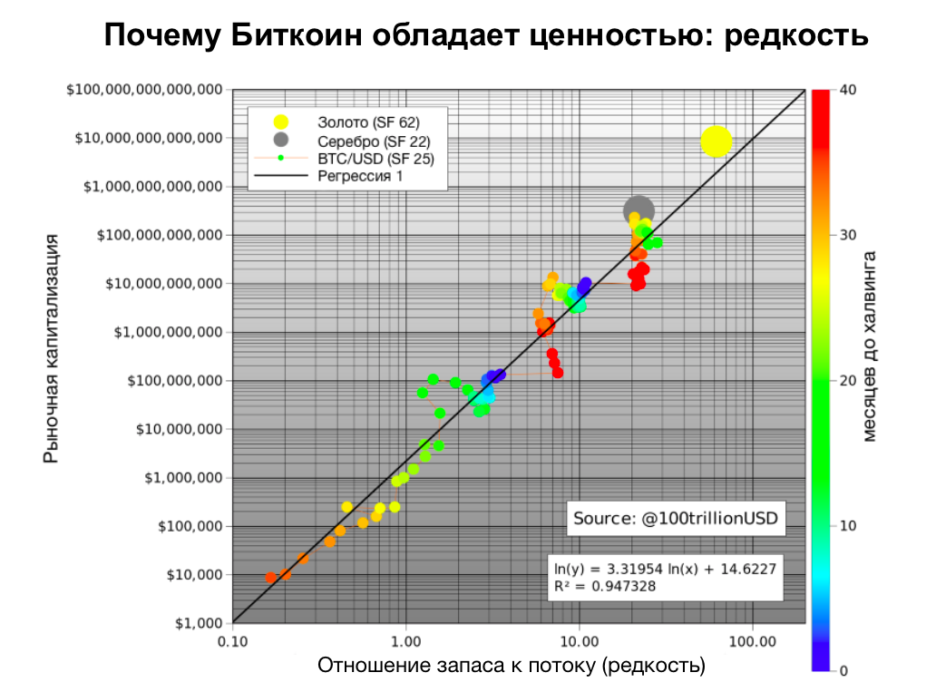Важно пояснить значение соотношения запаса к потоку, так как это соотношение является показателем редкости любого товара. Запас — количество товара в обращении, а поток — количество товара, производимого в год. Делим запас на поток: чем выше результат, тем сложнее манипулировать ценой данного товара. Это — что-то вроде природной рыночной инфляции в контексте свободных рынков. У золота данный показатель равен 62, у серебра — 22. У Биткоина он удваивается примерно каждые 4 года, но это, опять же, тема для отдельного обсуждения.. скорость и доступность производства не менее важны, чем редкость сама по себе.