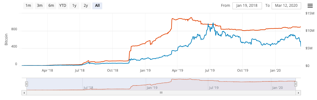 Совокупная емкость лайтнинг-каналов сети Биткоин. (красная линия - BTC, синяя - USD). Источник
