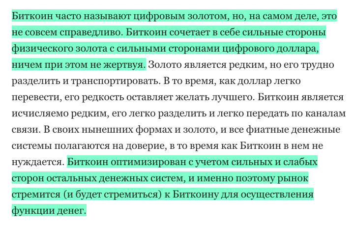 “Биткоин — сильная валюта: его среда — интернет; он освобождает своих пользователей от необходимости в третьих лицах; он экономит деньги бизнесам; он дефляционный; любой может проверить его код; Биткоин разработчики работают, не покладая рук, чтобы улучшить его; список можно продолжать. Сетевые эффекты Биткоина могут сделать его только сильнее. Конкурентам стоит быть начеку.”
