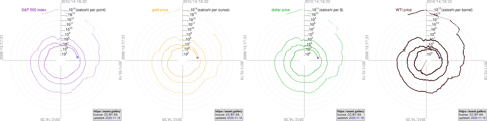 Следовательно, биткоинеры любят говорить о покупательной способности, потому что она не зависит от номинальной стоимости, оцениваемой в фиатной валюте. Обратите внимание, например, что диаграмма BTC разнится в зависимости от того, что вы используете в качестве мерила, будь то USD (доллар США), ARS (аргентинское песо), NGN (нигерийская найра), VED (венесуэльский боливар) или что-то совершенно другое, например, S&P 500, золото или нефть.
