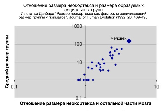 Когнитивные способности – здесь, в виде относительного размера неокортекса для нашего вида – устанавливают предел размеру групп, которые могут образовывать приматы. Поддержание животных групп или близких групп общения требует от человека значительной эмоциональной вовлеченности и инвестирования во взаимоотношения – как обоюдная чистка шерсти у приматов или сплетни, юмор, рассказывание историй и прочие разговоры, песни и игры в традиционных человеческих группах. Для преодоления когнитивных ограничений человека – того, кто или сколько людей могут принимать участие в объединении (знаменитое “число Данбара”, около 150 человек) – необходимы институциональные и технологические инновации. (Источник)