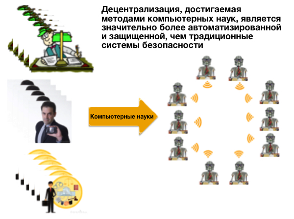 Если мы можем обеспечить безопасность наиболее важной функциональности финансовой сети при помощи компьютерных наук, вместо традиционных бухгалтеров, регуляторов, следователей, полиции и юристов, то мы двигаемся от локальной системы с ручным управлением и непоследовательной безопасностью к автоматизированной, глобальной и намного лучше защищенной. Криптовалюты, будучи правильно реализованными на основе блокчейна, могут заменить собой целую армию компьютеров для большого количества традиционных банковских служащих. “Эти блокчейн-компьютеры позволят нам подвести под наиболее важные части наших онлайн-протоколов намного более надежную и безопасную основу и сделать возможными фидуциарные взаимодействия, которые мы ранее не осмеливались реализовать в глобальной сети”.