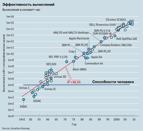 С середины 20-го века эффективность компьютерных вычислений возросла на много порядков, но люди по-прежнему используют тот же самый мозг. Это создало целый ряд возможностей для преодоления ограничений человеческого сознания и институтов, основанных исключительно на нем, при помощи вычислительных возможностей, переложив на компьютеры то, что они делают лучше всего, и освободив человеческие умы для того, в чем они продолжают оставаться непревзойденными. Люди по-прежнему обладают не бóльшими умственными способностями для масштабирования наших институтов, чем имели когда-либо. Но существует множество возможностей для улучшения социальной масштабируемости путем замены некоторых функций человека вычислительными. (Важное замечание: этот аргумент зависит от угла наклона, а не абсолютной позиции, линии способностей человека. Абсолютная позиция, приведенная выше, является произвольной и зависит от того, какого рода человеческие “вычисления” мы измеряем).