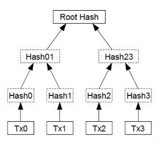 Дерево Меркла из четырех транзакций (от tx0 до tx3). В сочетании с надлежащей репликацией и цепочками блоков транзакций, защищенных при помощи алгоритма Proof-of-Work, деревья Меркла могут исключить возможность подделки данных (например, транзакций) после их записи при помощи консенсусного алгоритма. В Биткоине корневой хэш (root hash) Меркла используется для подтверждения неизмененного состояния всех транзакций в блоке.