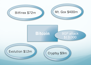Некоторые из крупных хищений в обширной экосистеме Биткоина. В то время, как блокчейн Биткоина сам по себе, вероятно, наиболее безопасная из существующих финансовых сетей (и, в действительности, должна оставаться намного более безопасной, чем традиционные платежные сети, чтобы сохранять низкий уровень затрат на управление и широкие возможности бесшовных трансграничных переводов), его периферийные сервисы, реализуемые на старых централизованных веб-серверах весьма небезопасны.
