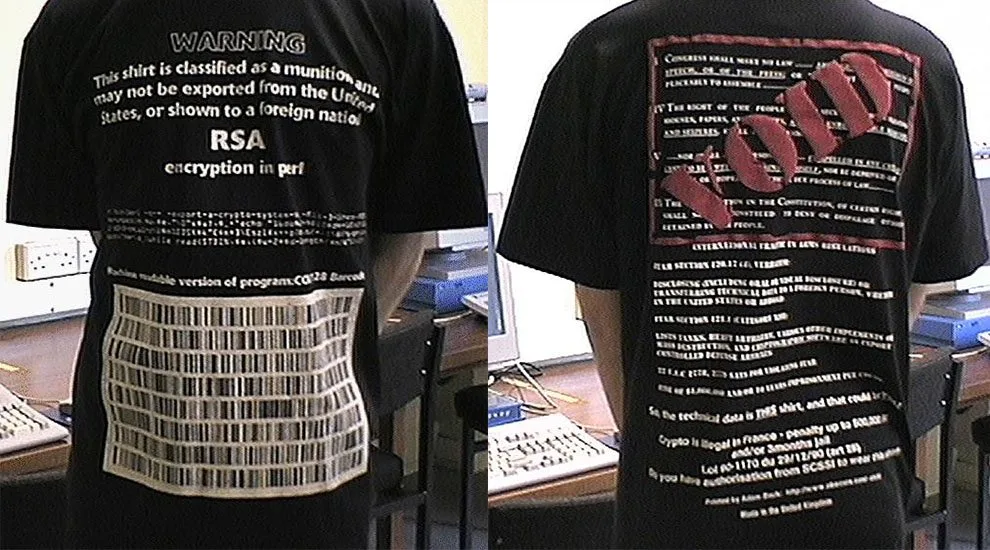 С годами Адам Бэк, получивший докторскую степень в 1996 году, стал одним из самых активных участников этого списка, иногда отправляя десятки писем в месяц. Как и большинство шифропанков, криптограф был увлечен такими темами, как приватность, свобода слова и либертарианство, и участвовал в технических обсуждениях, касающихся анонимных ремейлеров, зашифрованных файловых систем, электронных денег, представленных доктором Дэвидом Чаумом, и многого другого. Но некоторое время Бэк был, пожалуй, наиболее известен тем, что печатал и продавал “боевые” футболки – футболки с напечатанным на них протоколом шифрования, призванные подчеркнуть абсурдность решение правительства США регулировать программу шифрования Фила Циммермана PGP (Pretty Good Privacy) как “вооружение” в соответствии с определением американских правил экспорта. Ношение футболки Бэка при пересечении границы для выезда из США технически делает вас “экспортером оружия”.