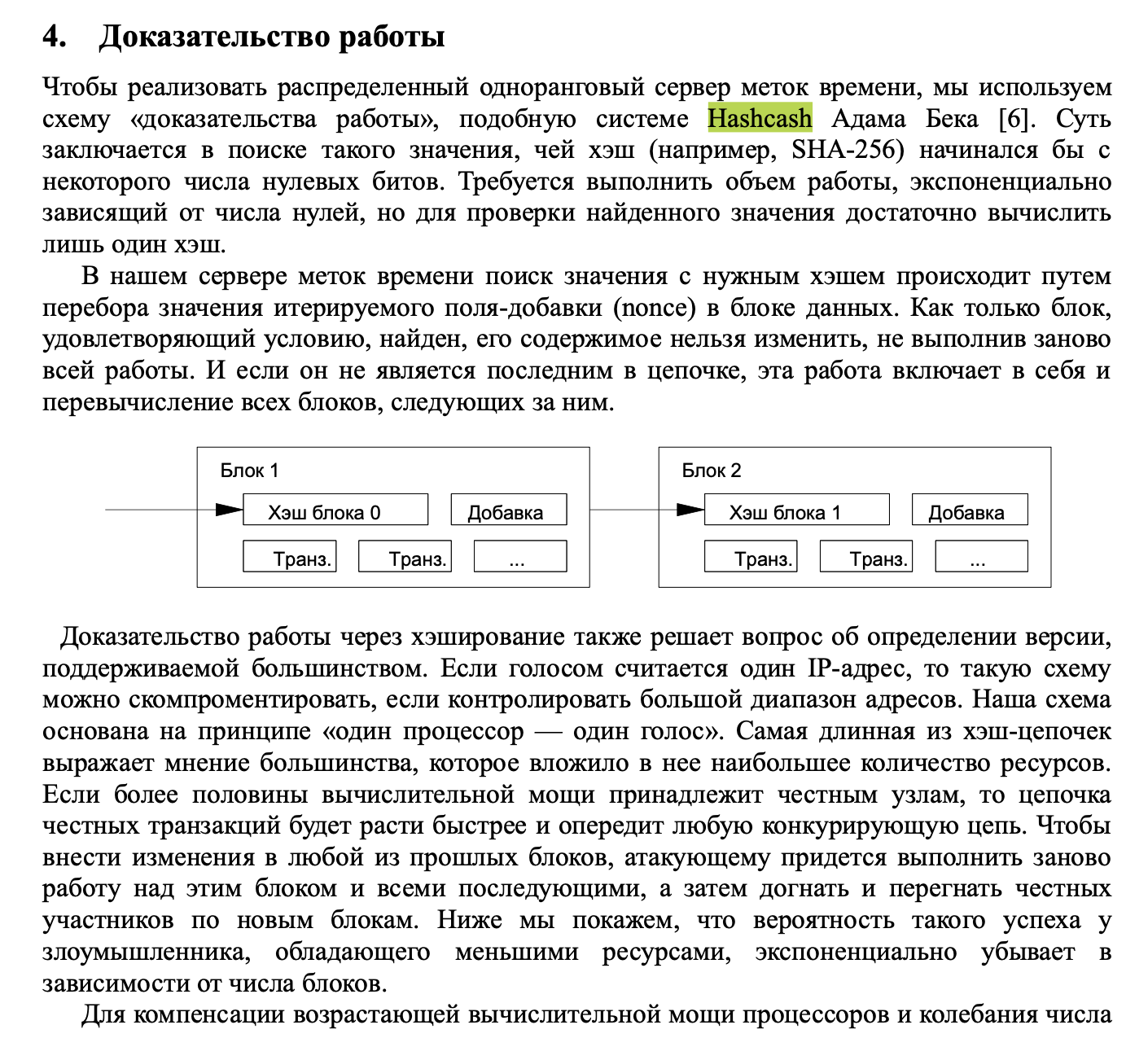 В конечном итоге, конечно, доказательство работы стало краеугольным камнем для Биткоина, а Hashcash – одной из немногих ссылок в его белой книге.