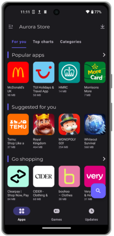 Aurora Store - это FOSS-версия магазина Google Play. Aurora очень похожа на традиционный Play Store и позволяет загружать и обновлять любые приложения, которые вы обычно находите через Google.
