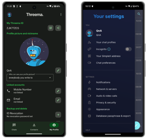 - Threema - предлагает схожий с Simplex функционал, но было запущено раньше и, как следствие, кажется более отлаженным. Приложение Threema не бесплатно, пожизненная лицензия стоит $4,99 и может быть куплена за биткоин. Threema предлагает веб-клиент и приложения для компьютеров. Приложение для Android доступно через F-Droid.