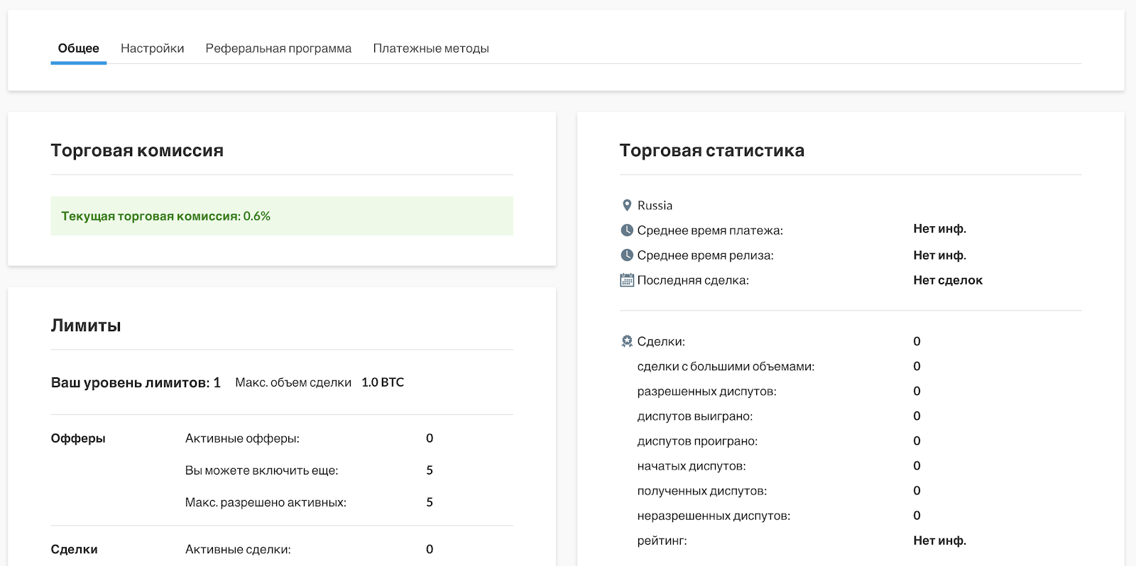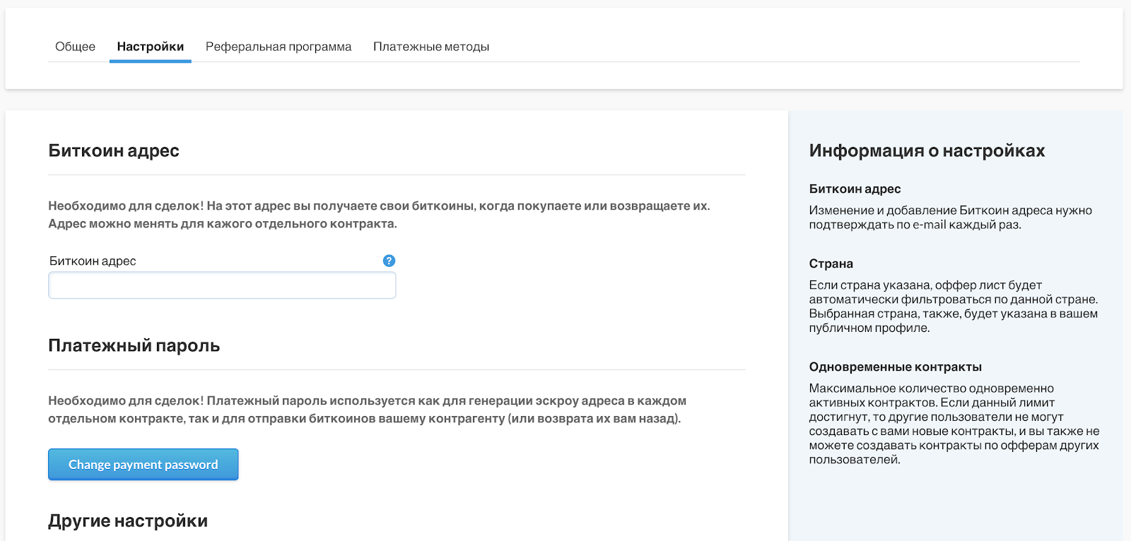 В разделе “Настройки” вы можете указать Биткоин-адрес, на который по умолчанию будут приходить средства при покупке, а также в случае использования реферальной программы — все бонусы от сделок ваших рефералов. При этом я советую использовать новый адрес при каждой новой сделке — это значительно повысит ваш уровень приватности в сети Биткоин. Я оставлю ссылку на пост, детально поясняющий эту тему.