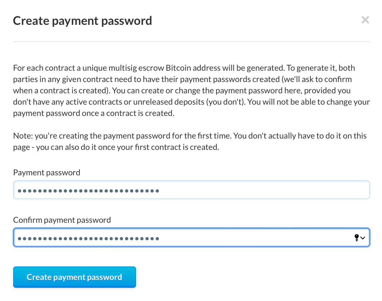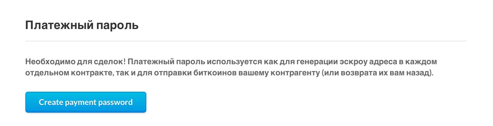 Также здесь можно создать и позже сменить платежный пароль, необходимый для подтверждения сделок. Платежный пароль – важная составляющая использования площадки. Он необходим при создании сделки и при ее финализации. Отнеситесь к его созданию и хранению ответственно – потеряв платежный пароль вы можете столкнуться с ненужными трудностями.