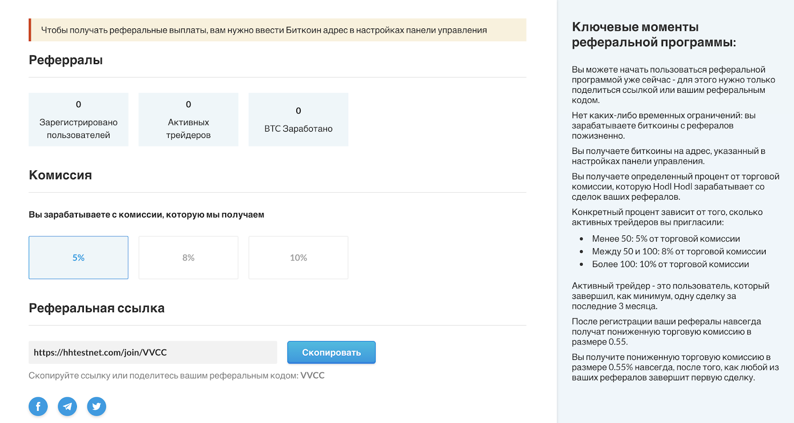 У HODL HODL, как вы уже поняли, есть реферальная программа, позволяющая получать небольшие бонусы от каждой сделки ваших рефералов. Мелочь, но приятно ;) В разделе “Реферальная программа” вы можете проверить количество трейдеров-рефералов и ваши начисления. Все подробности предоставлены в правом столбце этого раздела: