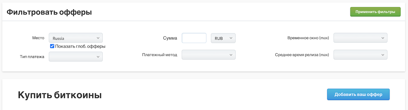 Ну что ж, перейдем к покупке биткоинов. Для этого переходим в раздел “Купить BTC”. Мы сразу же видим блок, предлагающий выставить интересующие вас параметры, такие как страна, тип платежа, желаемая сумма и другие. Таким образом можно отфильтровать результаты предлагаемых офферов. Вы также можете создать собственный оффер.