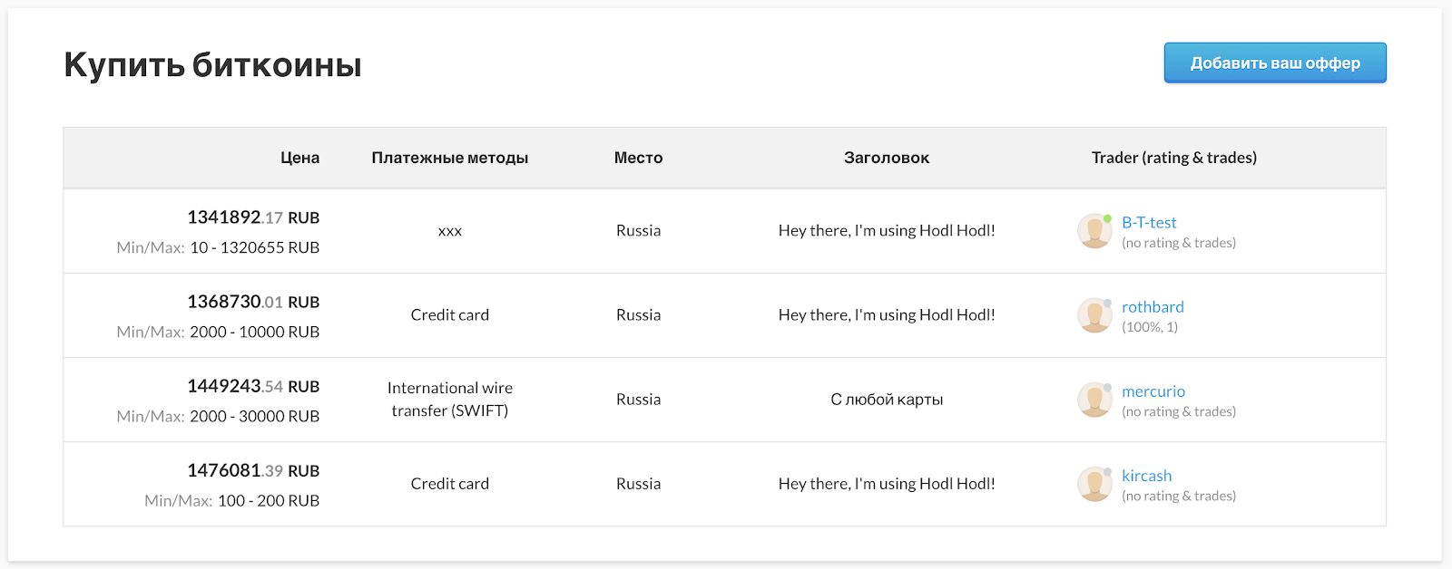 Итак, выберем подходящий нам оффер. Я уже создал оффер на дополнительном аккаунте специально для демонстрации всего процесса покупки биткоинов, так что выберу его. Естественно, в основной, не тестовой версии офферов гораздо больше.