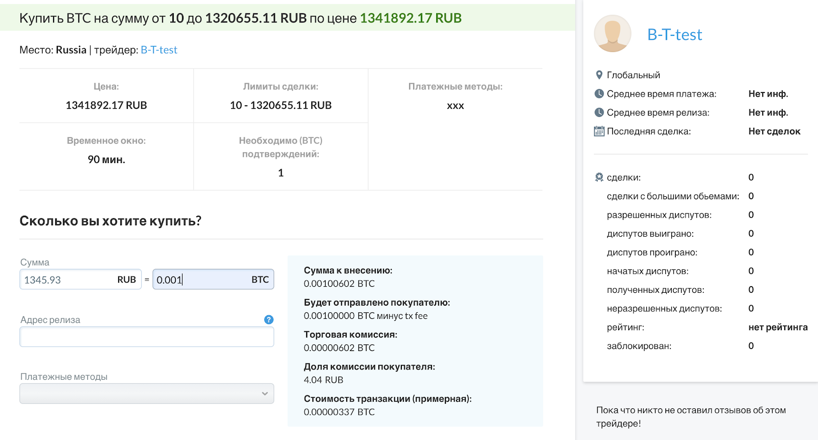 Кликнув на оффер мы можем уточнить основную информацию о сделке, выбрать сумму покупки, указать адрес релиза биткоинов, то есть адрес, на который придут купленные монеты и оценить сумму и финансовую информацию о сделке. В правой части экрана также предоставлена информация о потенциальном контрагенте: