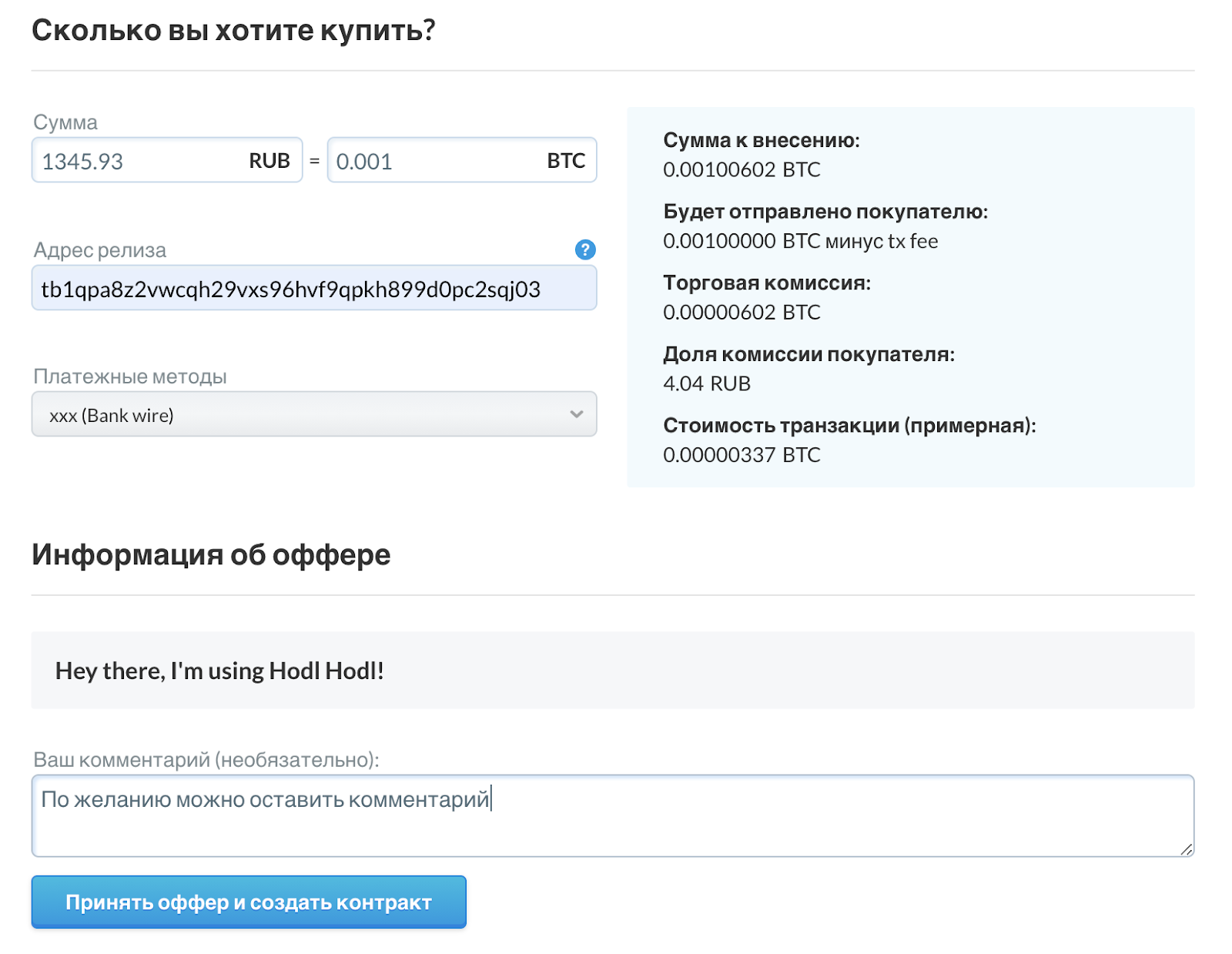Далее вам, как покупателю, необходимо дождаться подтверждения о появлении средств на мультисиг-кошельке и произвести оплату в соответствии с обговоренными в контракте условиями. Обратите внимание, что HODL HODL – площадка-посредник в вопросе передачи биткоинов от продавца к покупателю. Она не взаимодействует с фиатными валютами или другими платежными системами вне Биткоина. Это значит, что, оплачивая покупку биткоинов контрагенту, ответственность за отправку средств – будь то банковский перевод, перевод “с карты на карту” или любой другой способ, вся ответственность за этот перевод лежит на вас. Вы должны скопировать предоставленные продавцом данные, убедиться в правильности заполнения его данных (например в приложении вашего банка) и отправить верную сумму на правильный адрес. Если вы допустите ошибку на этом этапе, HODL HODL никак не сможет повлиять на решение банка по возмещению средств или заставить продавца, не получившего деньги, выслать вам биткоины.
