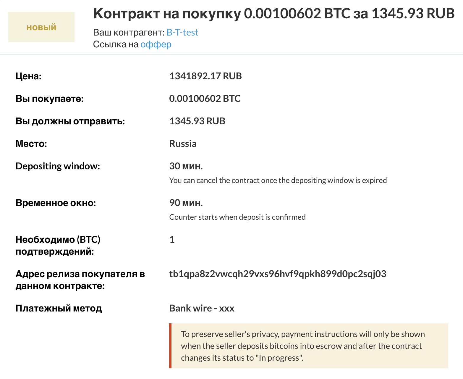 Перед нами появляется окно созданного контракта. Здесь заключается основная разница в использовании p2p площадок по сравнению с кастодиальными биржами. Я вкратце поясню как работает эта система.