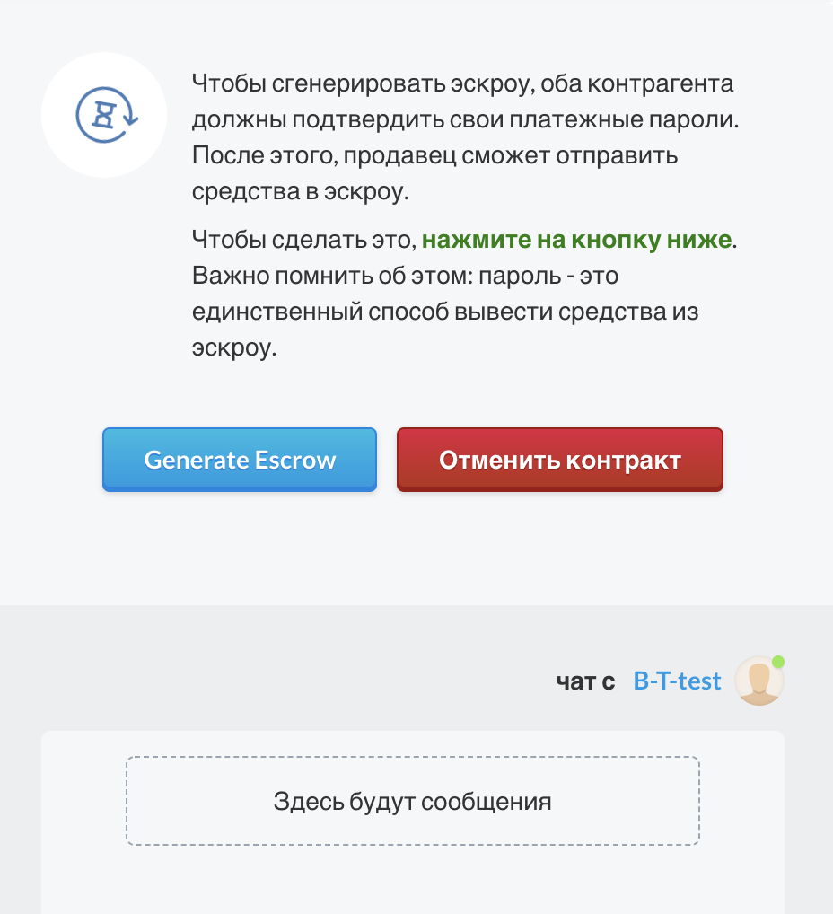 Если вы ранее сгенерировали платежный пароль, введите его в предоставленное поле, если нет, площадка попросит вас сделать это на данном этапе. Обратите внимание, что ниже есть чат, в котором вы можете лично пообщаться с контрагентом.