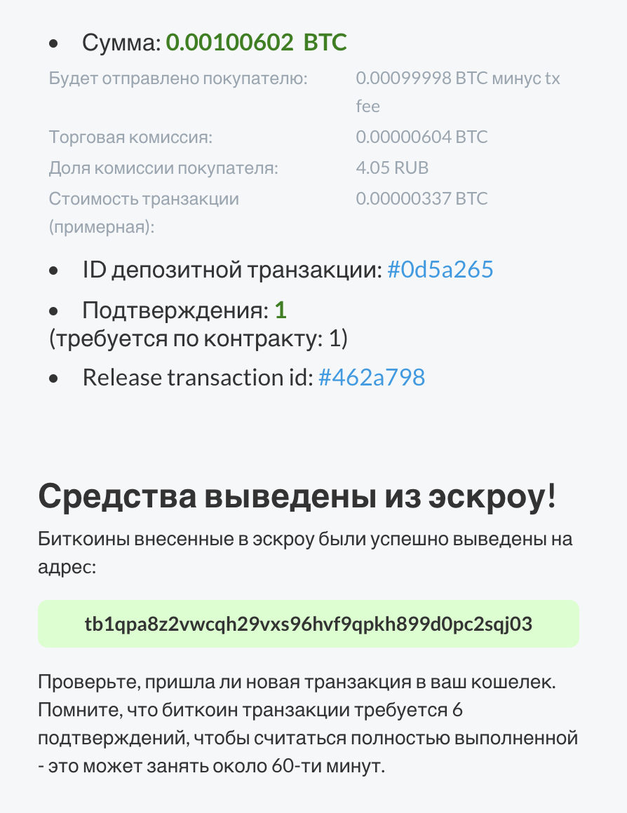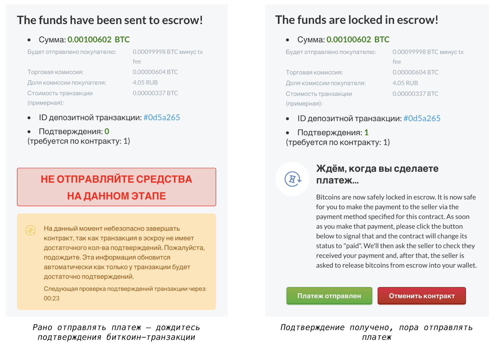 Обязательно дождитесь подтверждения транзакции, иначе есть риск того, что продавец сможет отменить транзакцию и вернуть биткоины, получив ваш перевод. В очень редких случаях диспута следует немедленно обратиться к команде HODL HODL.