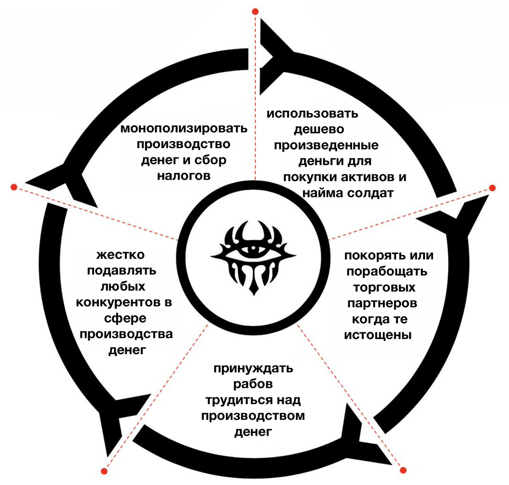 На самой вершине пирамидальной схемы фиатных валют находится золото, технология, выбираемая в качестве денег совокупной свободной волей (коллективным Логосом) бесчисленного множества предпринимателей на протяжении всей истории. Абстракции бумажной валюты над золотом вводились только для того, чтобы упростить обмен золотом, а не с тем, чтобы заменить его собой. Со временем возможность обменять валюту на золото была ликвидирована, что дало правительствам полный контроль над дефицитностью валюты, а значит, и неограниченную возможность конфисковать благосостояние своих граждан, компрометируя объем предложения валюты.