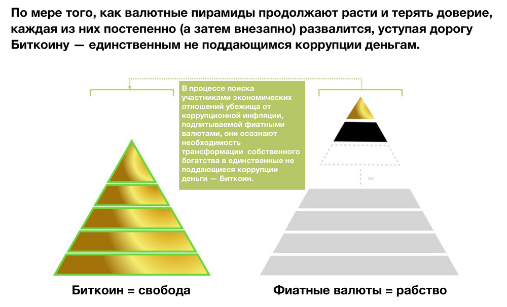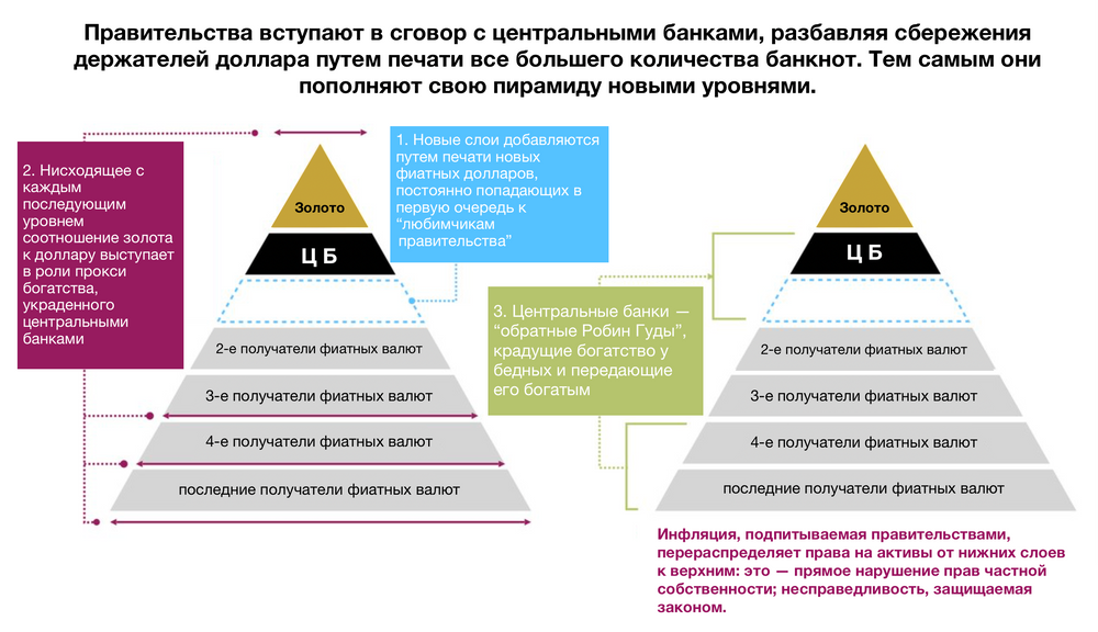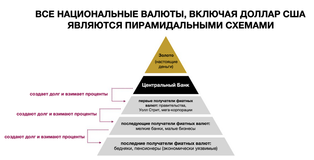 В результате систематизированного многоходового мошенничества правительств эти финансовые пирамиды стали доминировать в мире. Фиатные валюты — это основанные на долговых обязательствах заменители денег, которые контролируются центральными банками, навязывающими эти денежные сети пользователям и принудительно (или насильственно) подавляющими любую конкуренцию на этом рынке. Самое отвратительное, что больше всего от этой мошеннической системы страдают именно самые бедные члены общества, которые (по необходимости) держат большую часть своего благосостояния в фиатной валюте.